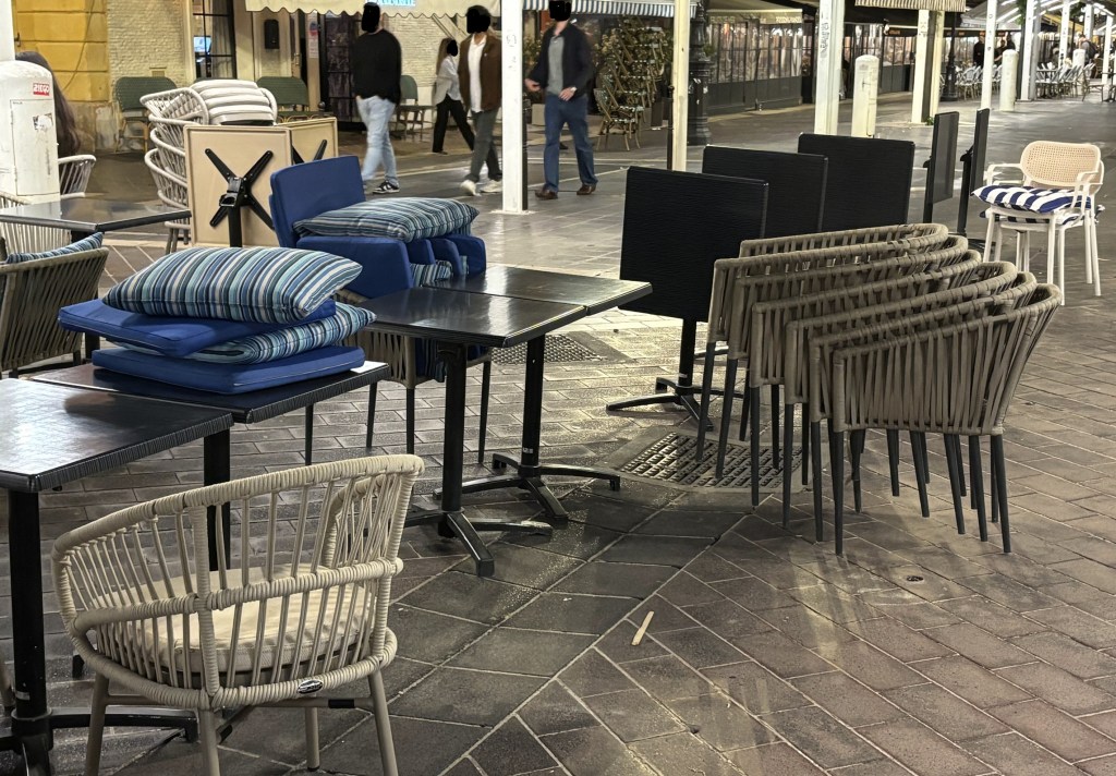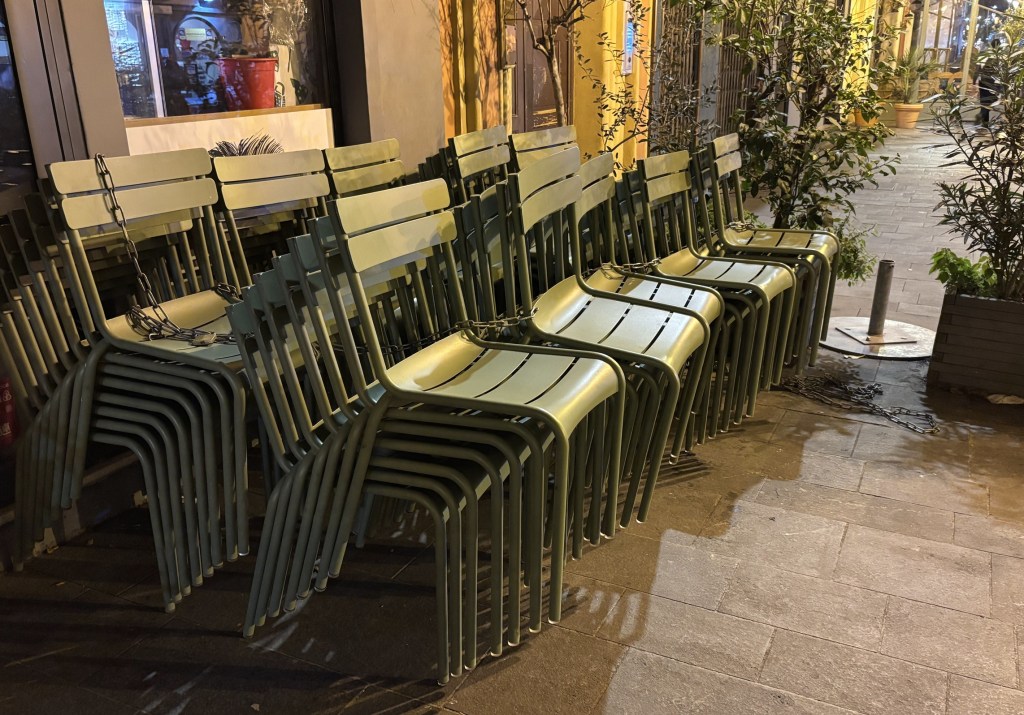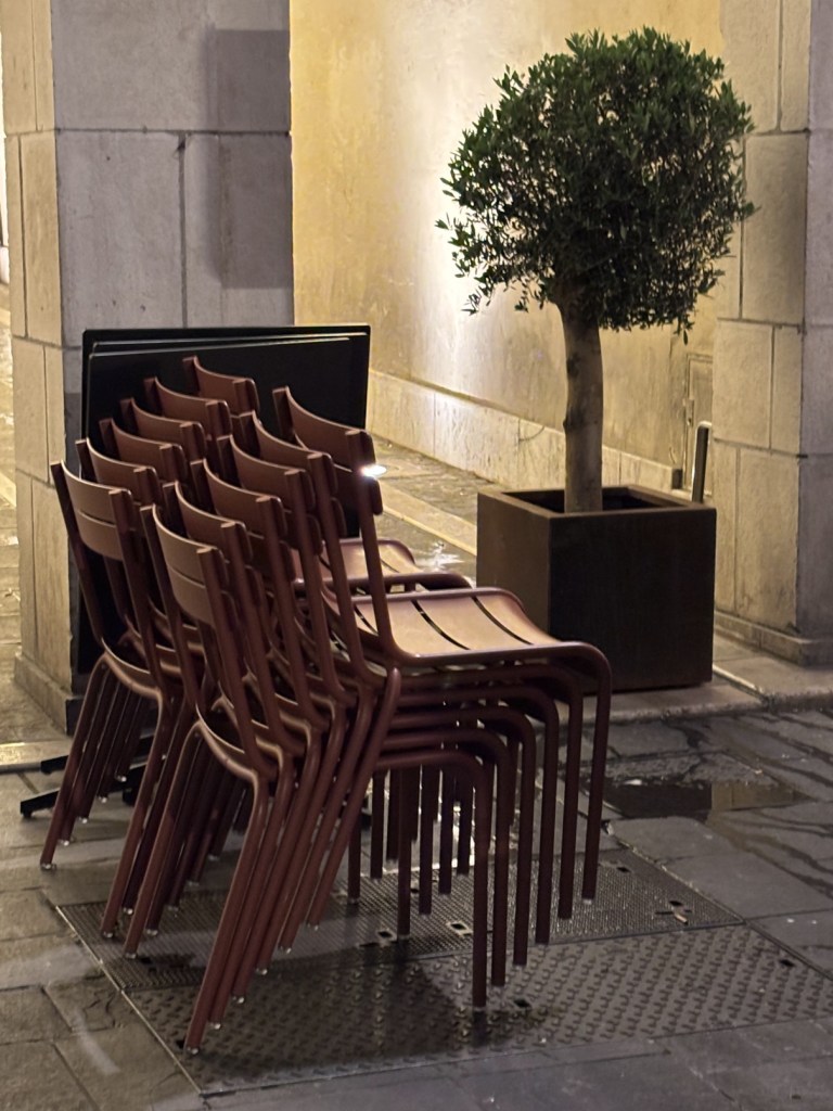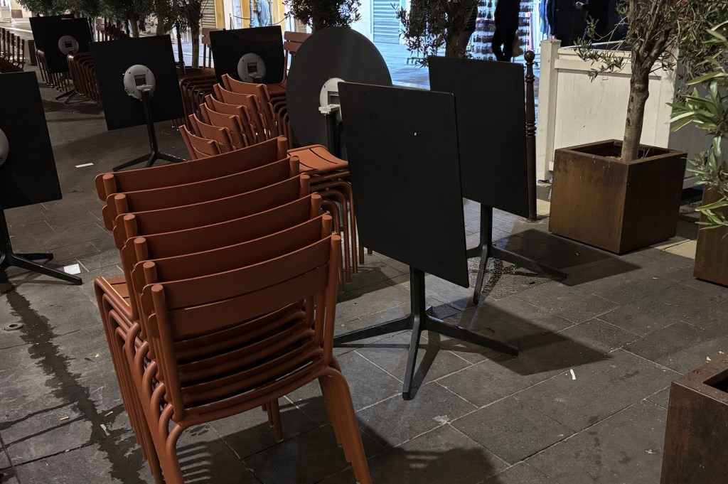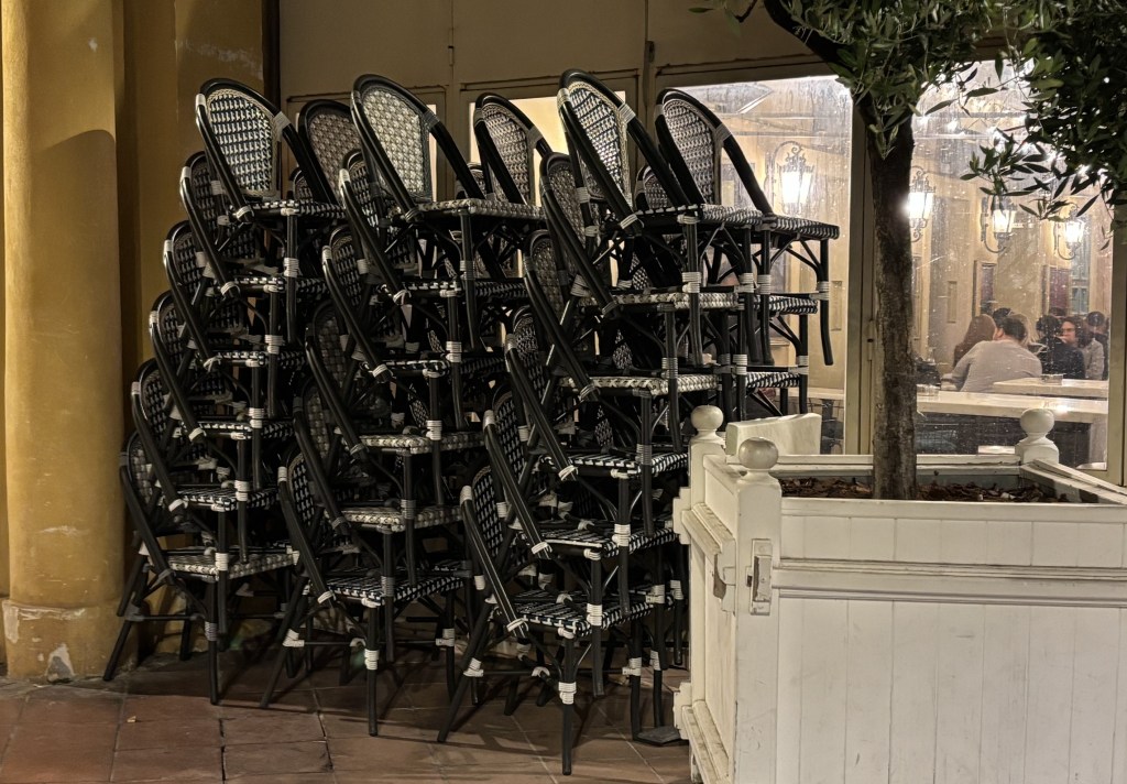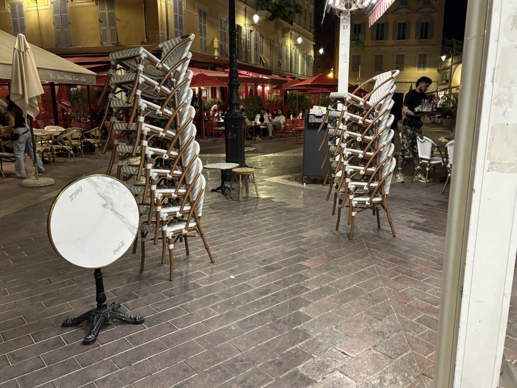 Quand je suis arrivée, je visais bien évidemment les tables au soleil. Mais elles étaient occupées. Les seules libres se situaient près de l’entrée et étaient à l’ombre. Un jeune homme vient m’accueillir. Je lui explique ce que je suis en train de faire : calculer, en projetant la course du soleil, quelle serait celle qui bénéficierait la première de ses rayons. Et je lui en désigne une. Il me dit que j’ai raison, mais qu’elle est réservée, et m’en suggère une autre, que j’accepte. Effectivement, une dizaine de minutes plus tard, je bénéficiais de la chaleur solaire. Quant à la table réservée, j’ai compris pourquoi et surtout à qui : à sa soeur et un ami venus… de l’Aveyron.