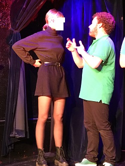 Car c’est l’un des principes de ce spectacle : pas de « spectateurs/trices », mais des personnes en interaction avec les acteurs, et même convoquées sur scène pour jouer avec eux, comme cette « Pimprenelle » choisie, avec deux autres personnes, dans le public pour réellement interagir sur scène en binôme avec un acteur.