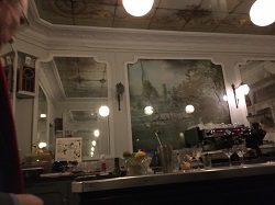 J’ai alors jeté un coup d’oeil à l’intérieur, m’attendant à trouver un espace aussi impressionnant que celui des Bouillons ou d’autres brasseries de ce style. Mais non. Un tout petit bar, peuplé de quelques jeunes femmes parfois accompagnées. Une fois entrée, je fus séduite par l’atmosphère très « cocooning » de cet espace bien clos sur lui-même, ouvert seulement sur les fresques des murs et du plafond, presque disproportionnées par rapport à la taille de cette pièce unique.