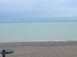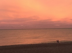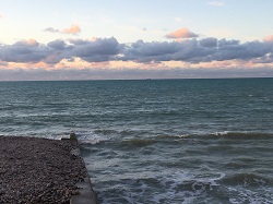 Le dimanche soir arrive. Voici donc plus de trois jours et trois nuits que le navire observé à mon arrivée en bord de Manche est immobile, là-bas, face à la côte. Immobile? Pas vraiment, car visiblement les marées le font « tourner ». Il se présente le plus souvent de profil, mais je l’ai aussi vu de face… Vous l’avez peut-être déjà repéré sur une de mes récentes photographies, montrant le rideau de pluie dans le lointain : il était alors cerné par ce rideau… Le voici maintenant le soir suivant, au couchant…