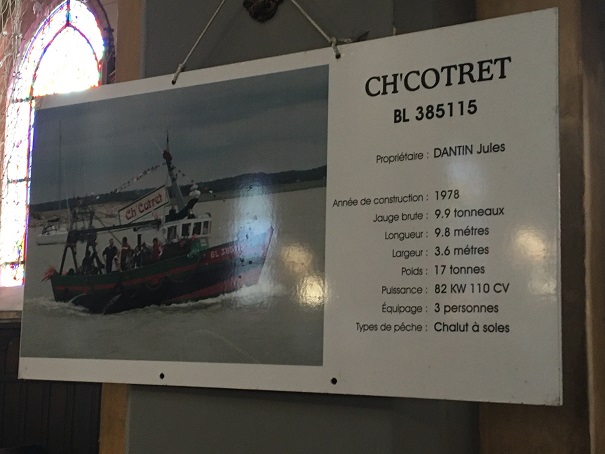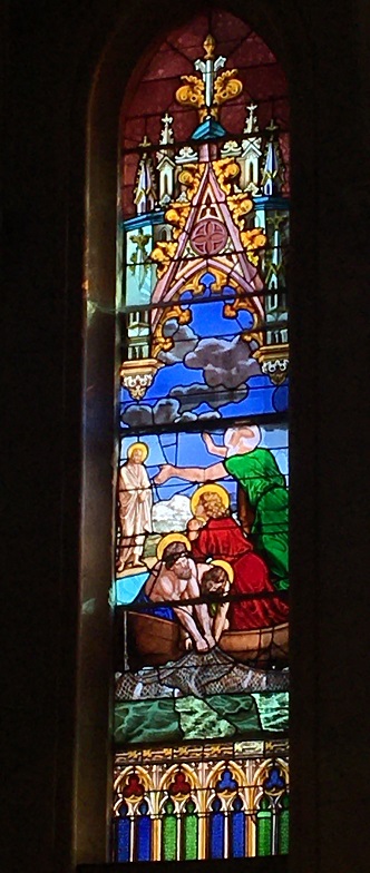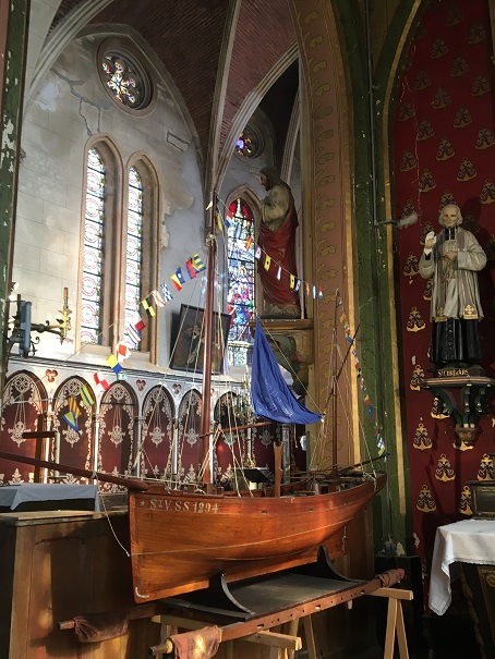Mais ce sont les vitraux qui m’ont le plus séduite. Derrière l’autel, trois d’entre eux mettent en scène la mer.