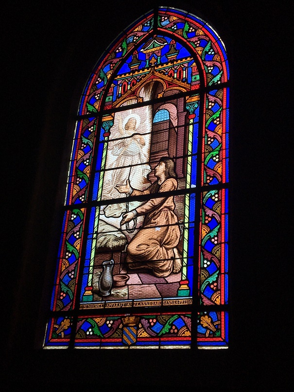 Et je crois deviner qui vous vous attendez à voir… La Jeanne, bien sûr. Pas celle de Brassens, mais celle d’Arc. Alors, à votre avis, est-elle dans l’église? Eh oui, bien sûr! D’abord, sur ce vitrail représentant l’apparition de Saint Michel à la jeune femme emprisonnée.