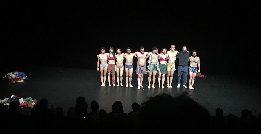 La compagnie avec son chorégraphe, Edouard Hue. (remarquez à gauche les tas de vêtements, dépouilles d’une des dernières scènes)