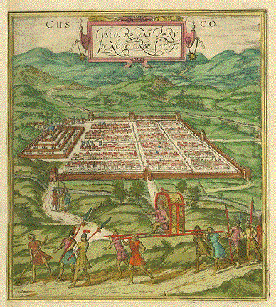 Inti, c’est le dieu du soleil, comme vous le voyez ci-dessus, sur cette image extraite d’un diaporama sur la religion inca, héliolâtre (adoration du soleil). Un temple est dédié au Dieu-Soleil à Cuzco, dans la forteresse de Sacsayhuamán (Aigle Royal), que l’on voit à gauche de cette gravure.