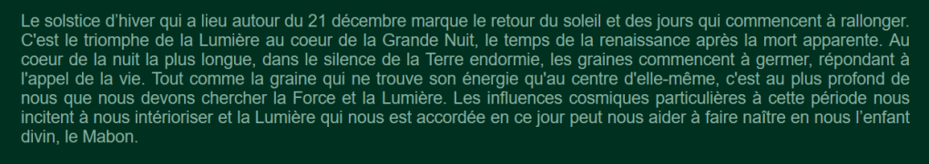 « Dans la Tradition, la bûche décorée que chacun apporte lors de la cérémonie pour nourrir le feu du Solstice d’Hiver rappelle la solidarité nécessaire entre les hommes pour traverser la période parfois difficile de la Saison Sombre, qui arrive à son acmé lors du Solstice. »