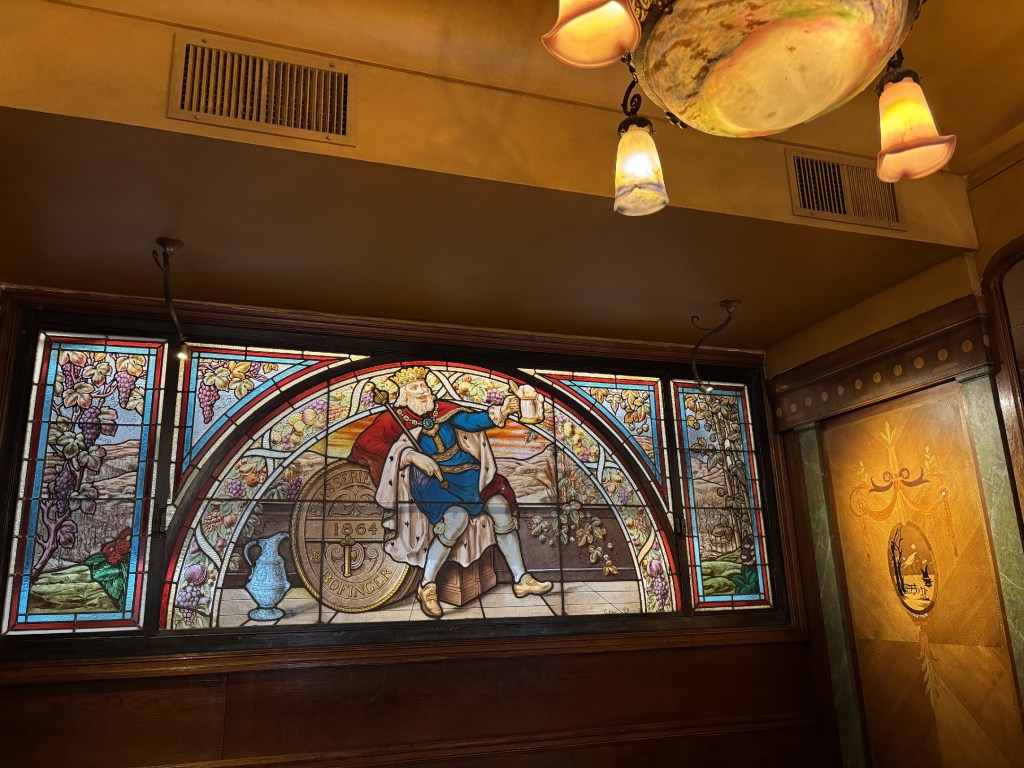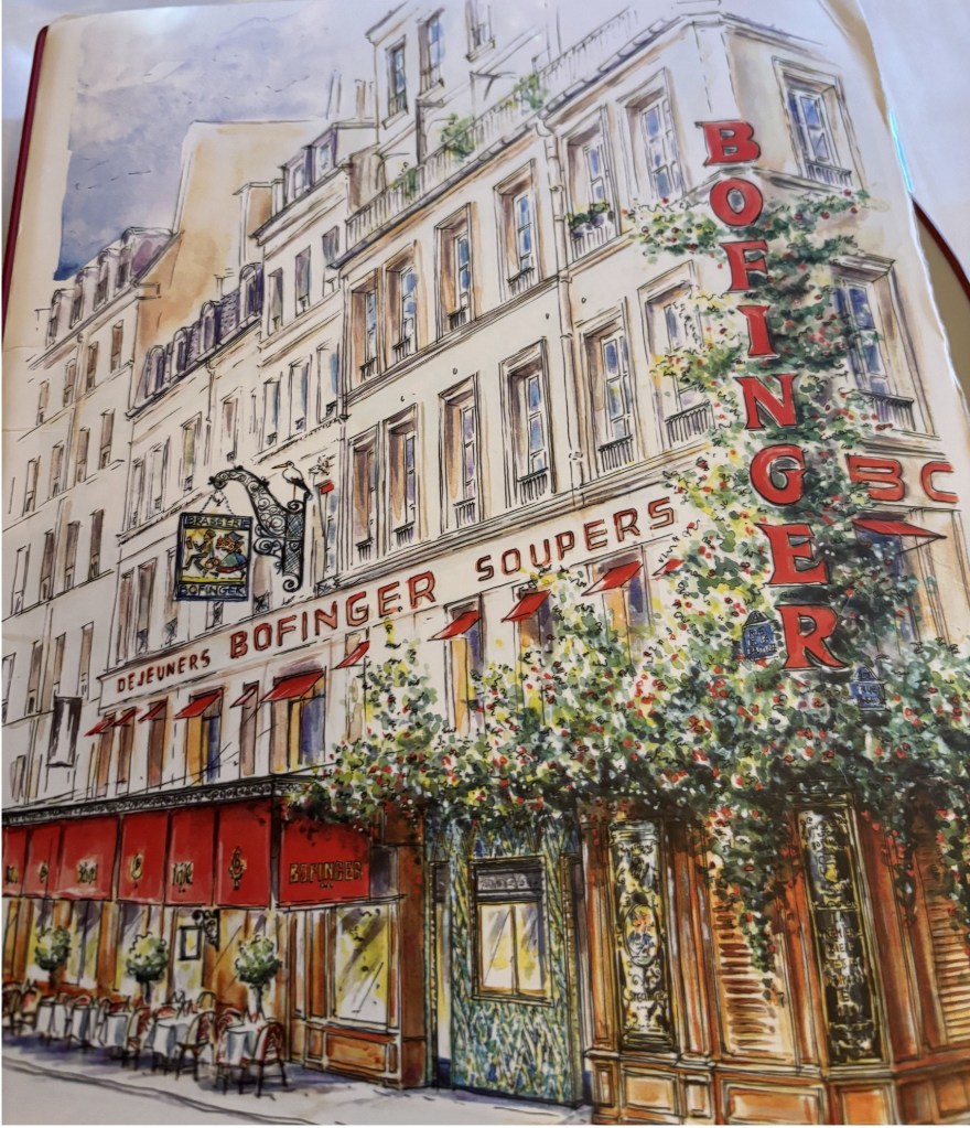 Fondée en 1864 par l’aubergiste alsacien Frédéric Bofinger, originaire de Colmar, elle sera la première brasserie parisienne à servir la bière à la pression, en 1870. Une partie du décor d’origine daterait de 1880. Après l’agrandissement de la brasserie en 1919, englobant trois boutiques avoisinantes, le décor a été refait de 1919 à 1921 par l’architecte Legay et le décorateur Mitgen, avec une coupole ovale ornée de motifs floraux. Le vitrail, au premier étage, montrant Gambrinus, Roi de la bière, est signé par les maîtres-verriers G. Neret et E. Royer ; les statues de hérons en céramique sont l’oeuvre du sculpteur Jérôme Massier. Après un nouvel agrandissement en 1930, une salle réalisée en 1931 à l’occasion de l’Exposition coloniale a été décorée de tableaux montrant des paysages alsaciens, réalisés par le peintre Jean-Jacques Waltz, dit Hansi, également auteur de l’enseigne de l’établissement. Les urinoirs, dont les montants sont ornés de têtes de dauphins, sont également à signaler. La devanture de l’établissement a été refaite en 1982, en chêne, à l’identique de celle de 1919. » (Base Mérimée)