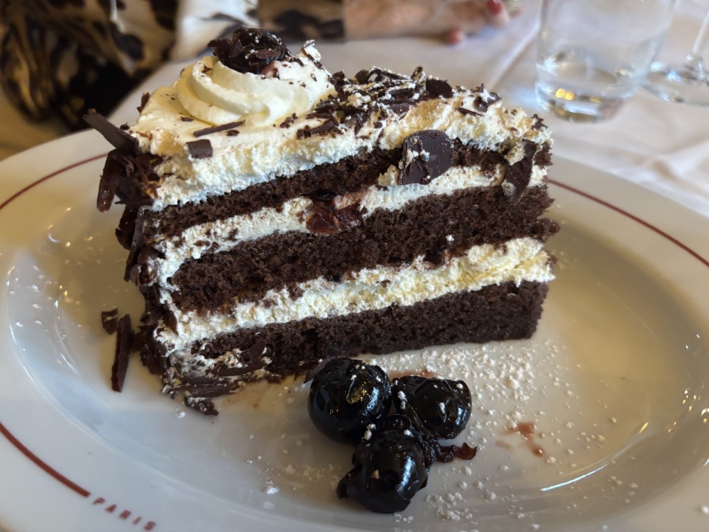 Elle était tellement copieuse que j’ai fait l’impasse sur le dessert, mais mon voisin s’est laissé tenter. Je lui ai conseillé la Forêt Noire. Il n’a pas été déçu!