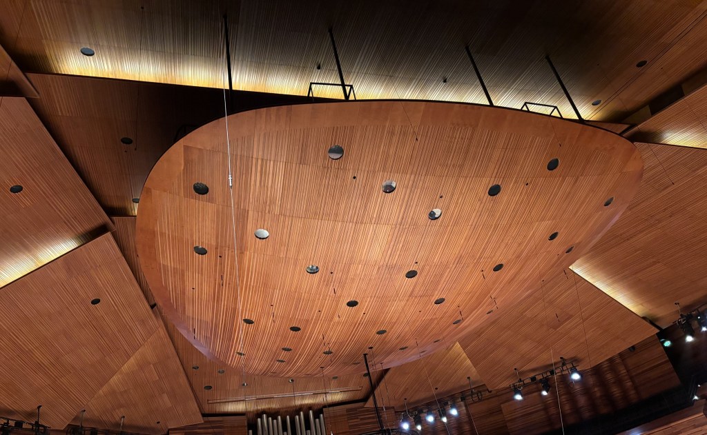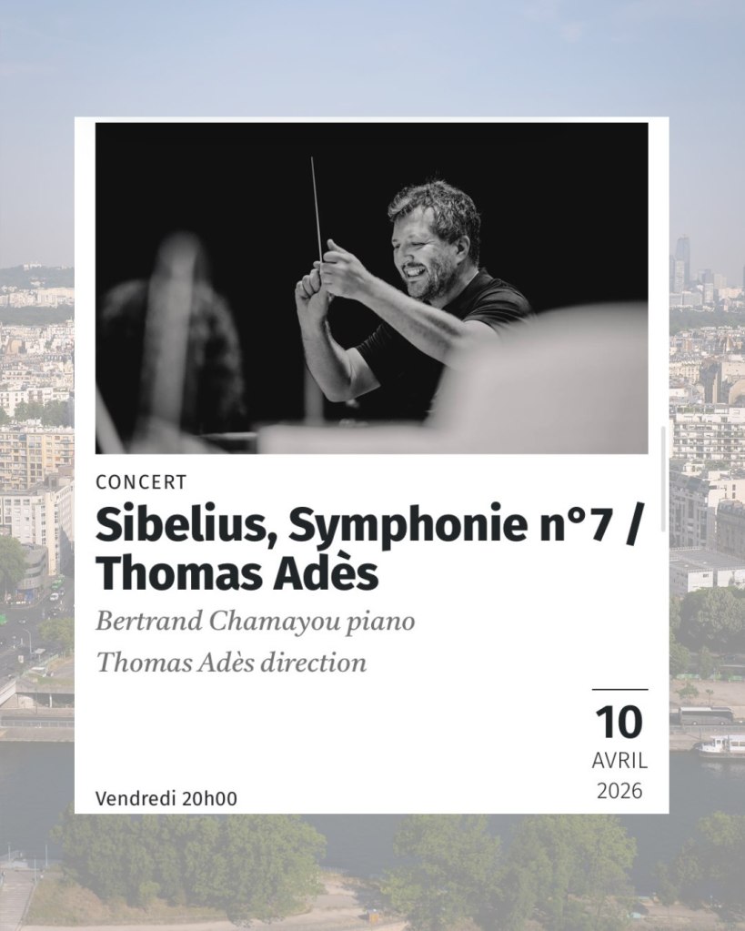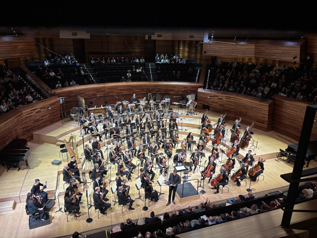Je suis toujours étonnée par le nombre impressionnant d’instruments dans un orchestre symphonique. Mais, cette fois, je le suis encore davantage. Pourquoi? Je ne sais. Peut-être les deux pianos? Les percussions très variées? Ou simplement le fait que, la scène étant plus petite que celle de la Philharmonie ou de la Seine Musicale, la quantité paraît supérieure? Mais voici qu’arrive un homme que je prends pour le chef d’orchestre.