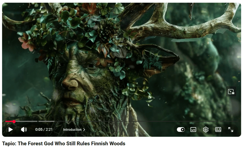 « Dieu ou esprit de la forêt, Tapio apparait sous forme humaine en général nu mais parfois magnifiquement habillé; il porte une magnifique barbe de lichen et d’épais sourcils en mousse.