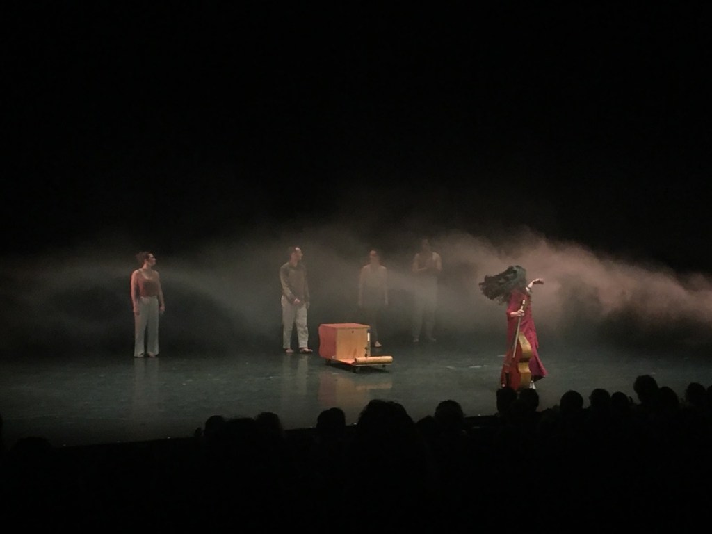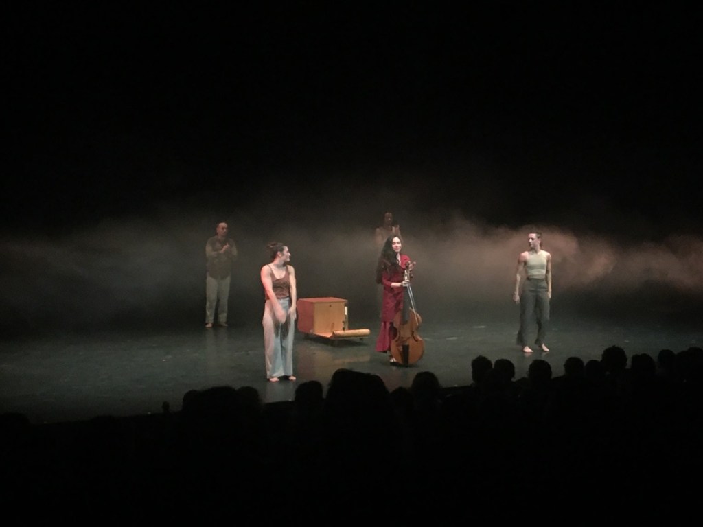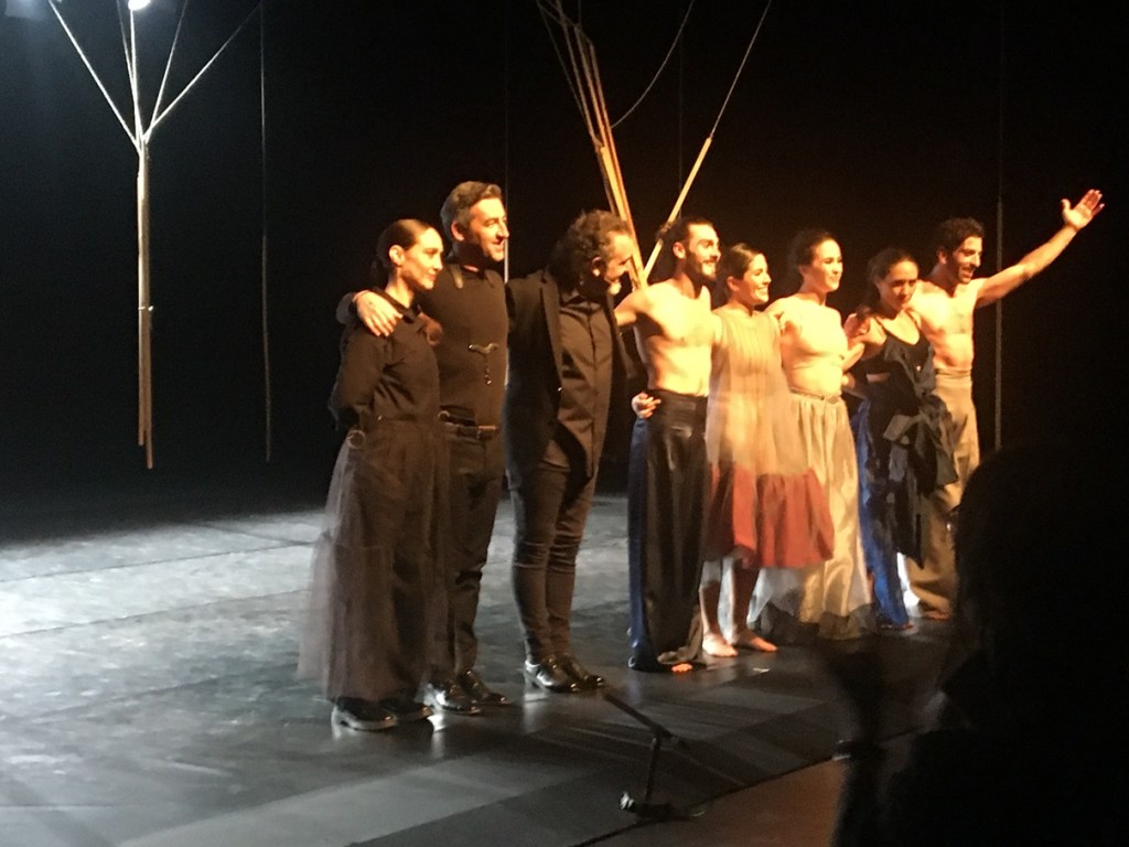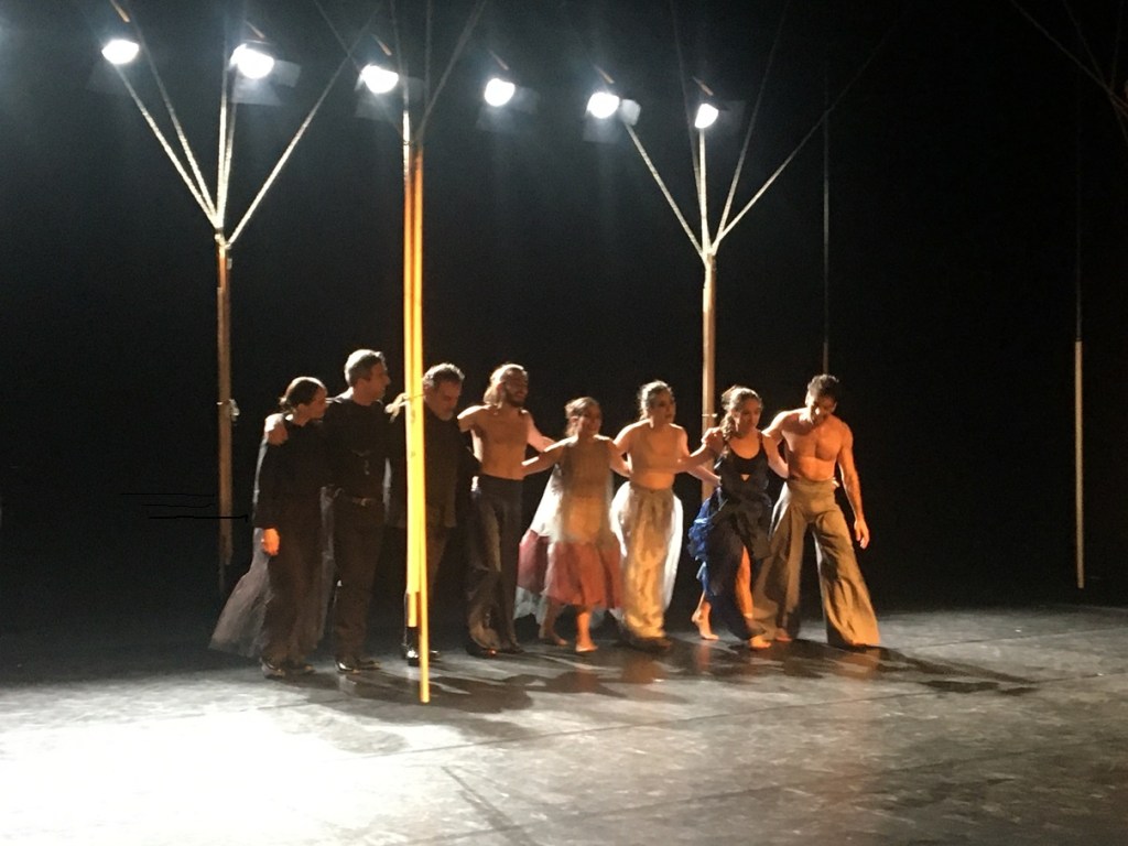 De gauche à droite : la chanteuse-violoncelliste, le joueur d’instruments à vent et à percussion, le chanteur, les quatre membres de la troupe, et à l’extrême gauche, le chorégraphe David Coria