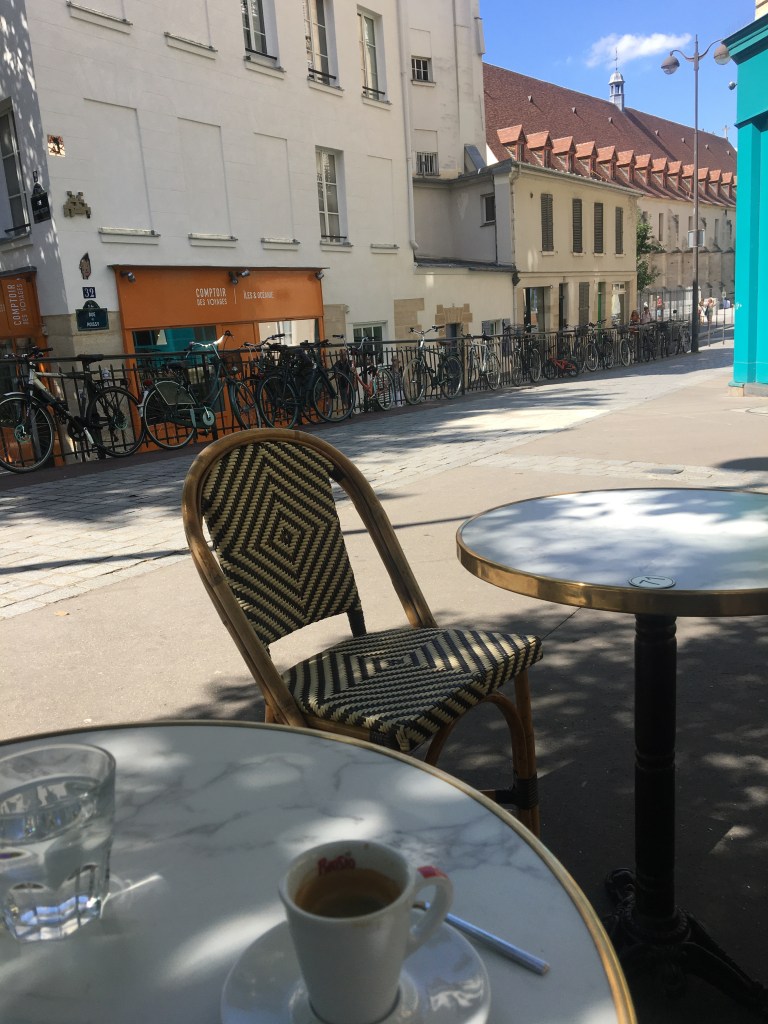 Autre surprise : pas de problème pour obtenir une place au tout dernier moment! Et quand je dis « tout dernier »… Il était 16h20 pour une entrée à… 16h20! Car il faut retenir, pour pénétrer dans les lieux, et les flux se font toutes les 20 minutes. Le prix me paraissait assez élevé (32 euros), mais en cet après-midi où toute randonnée était exclue et tout déplacement rendu difficile par la chaleur, on ne comptait pas! Un petit café à l’ombre, avant de gagner le Collège et pour éviter la queue au soleil…