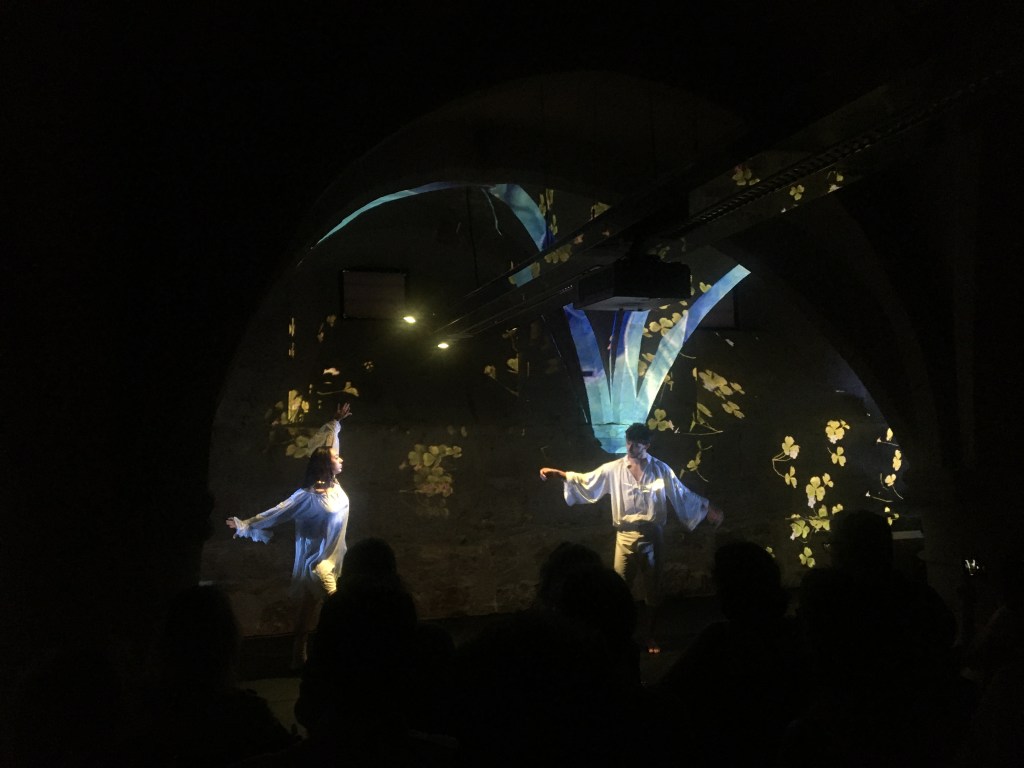 Les jeux de lumière répondent à la musique et à la danse, et la petite salle voûtée se transforme…