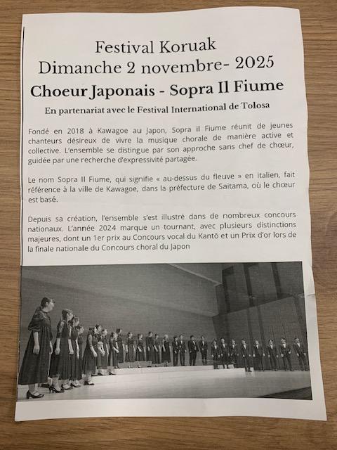 Me voici donc en cette fin d’après-midi au balcon du théâtre de la ville, la Scène Nationale, pour aller assister à la prestation d’une chorale japonaise au nom bien… italien ! Sopra il Fiume (au-dessus du fleuve). C’est le dernier de la liste ci-dessus, et l’un des deux payants, mais les billets n’étaient pas excessivement chers… En préparant cet article, j’ai découvert que le nom de l’ensemble fait référence à une petite ville au nord de Tokyo, Kawagoe, surnommée « La Petite Edo ».