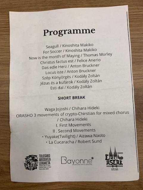 Je n’ai pas été déçue… Un répertoire éclectique, des chants superbement interprétés, des voix remarquables. Et j’ai été épatée par la tenue et la mémoire de ces jeunes qui ont chanté non seulement en japonais et en latin, mais aussi en anglais… et en espagnol, avec un bis de « La Cucaracha » (alias « Le Cafard ») chantée avec une originalité empreinte d’humour, accompagnée par la salle. Cela tranchait avec le silence recueilli qui avait accompagné l’ensemble du spectacle.