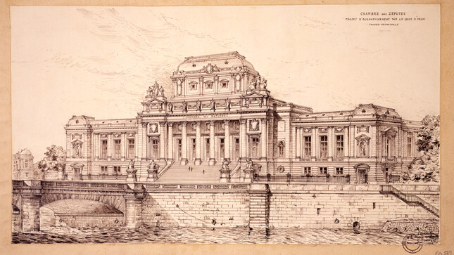 Soit pour en faire le « pendant » de l’église de La Madeleine, comme le montre ce projet dessiné par Alexandre Evariste Fragonard (1780-1850)…