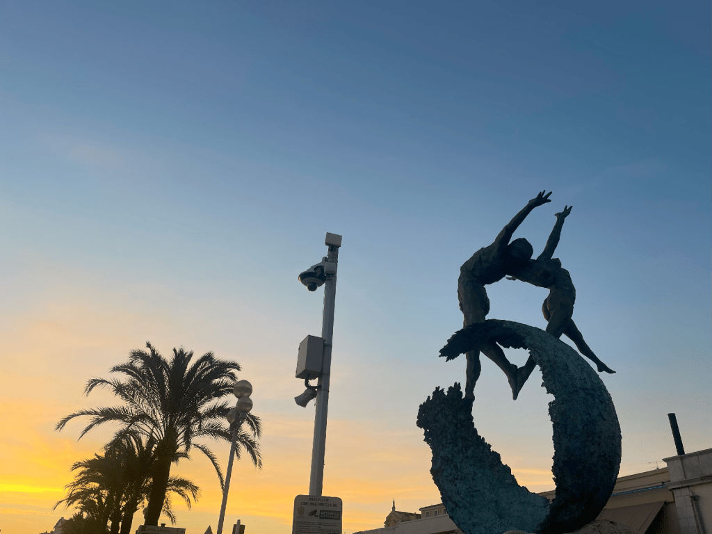 Tout simplement à cause d’une sculpture qui a attiré mon regard, hier au couchant, sur la Promenade des Anglais. Sculpture dont j’ai fait des photos, que voici…