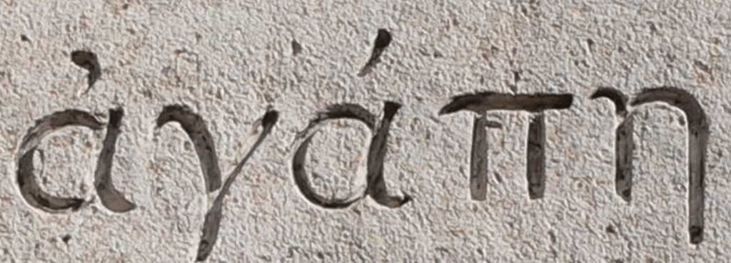 Pas question, je vous rassure, que j’entre dans ce débat. Ce qui m’intéresse aujourd’hui, ce ne sont pas les agapes, mais « agapè ». Toute la différence tient dans l’accentuation, qui correspond à un éta en grec. Le voici en grec ancien.