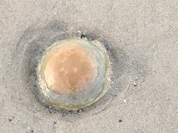Je vais bien sûr commencer par lever le voile sur l’énigme d’hier. Non, ce n’était pas un coquillage. Non, pas non plus un oeuf sur le plat… c’était une méduse échouée sur la plage proche de la Route Blanche, désormais effondrée, non loin de la Baie de Somme. Une méduse d’une quinzaine de centimètres de diamètre, qui attendait la marée montante pour refiler au large… Etonnant en cette saison, non? « Ah ma brave dame, il n’y a plus de saison », disaient déjà nos aïeux…