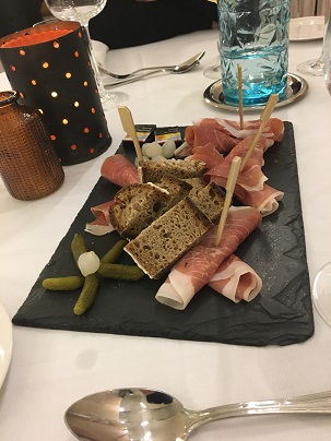 Car deux d’entre eux le seront. Amuse-bouche : du jambon de Bayonne finement découpé et roulé, avec du pain bis.