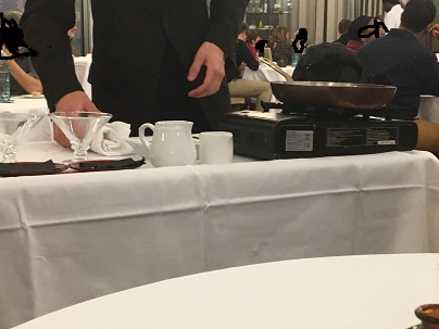 Des dessertes vont et viennent dans la salle tout au long de la soirée, avec des réchauds destinés à flamber les plats.