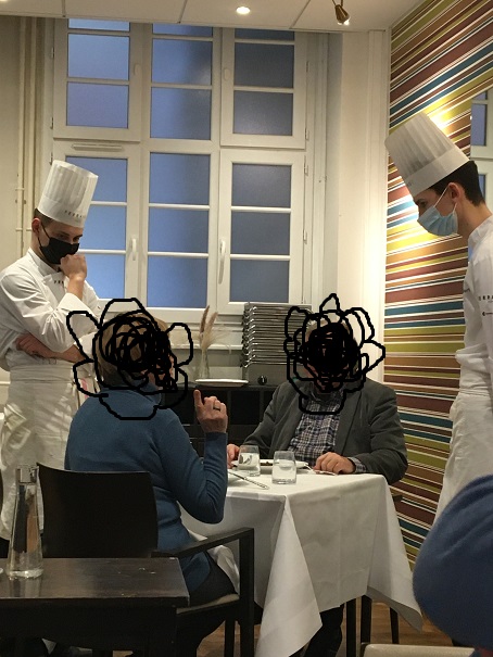 A la fin du repas, deux apprentis chefs, en toque, viennent s’enquérir des impressions des client-e-s. L’un est responsable des poissons, l’autre, de la viande.