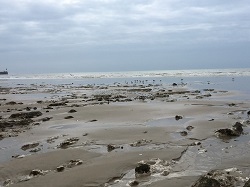 En ce samedi de mars où le soleil joue à cache-cache avec les nuages dans une douceur incroyable (15 degrés), me voici donc dévalant les galets de la plage de Mers pour atteindre le sable et marcher ainsi entre mer et terre, dans un no man’s land dont s’emparent deux fois par jour joyeusement les oiseaux, et où réside une faune marine très discrète.