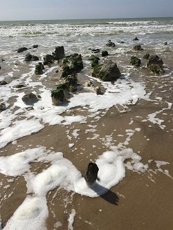 Les rochers émergeant du sable, ainsi que les blocs tombés des falaises, étaient entourés d’une belle écume blanche qui tremblotait sous le souffle d’Eole…