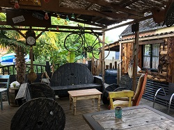 Mais revenons au Bar de la Source. Il a été repris voici quelques années par un homme charmant, qui aime visiblement son activité. Il a peu à peu transformé ce qui n’était qu’un petit bar fermé en un lieu de vie. Des jeux, d’abord. Des soirées repas convivial, ensuite. Puis création l’an dernier d’une terrasse. Et, cette année, décoration de celle-ci.