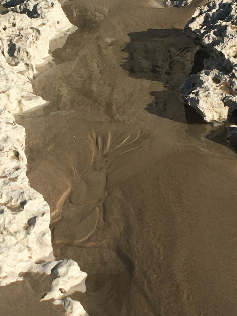 Je fus intriguée par des raies non rectilignes (a-t-on le droit d’adjoindre ces deux termes???) tracées sur le sable, alors que la mer venait juste de découvrir la plage, déserte depuis le retrait des ondes…
