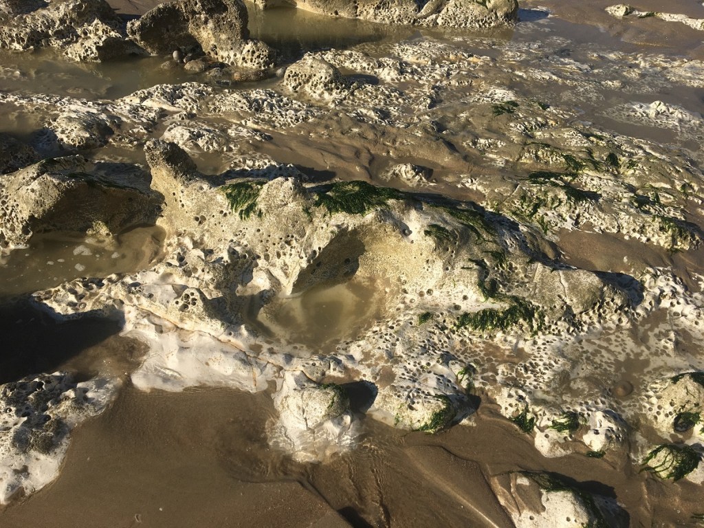 Quand j’étais petite, je venais avec mon grand-père « aux moules »… Il n’y en a plus guère, mais on peut remarquer les traces des travaux des Hommes à travers les temps, qui désormais font davantage penser à l’art sculptural moderne.