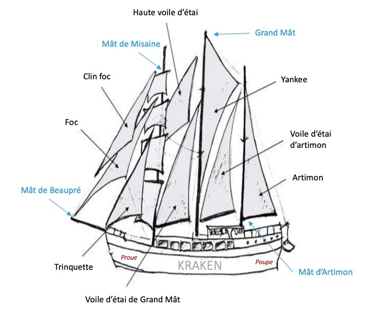 - une grand-voile d’avant au tiers sur vergue (le bourcet),