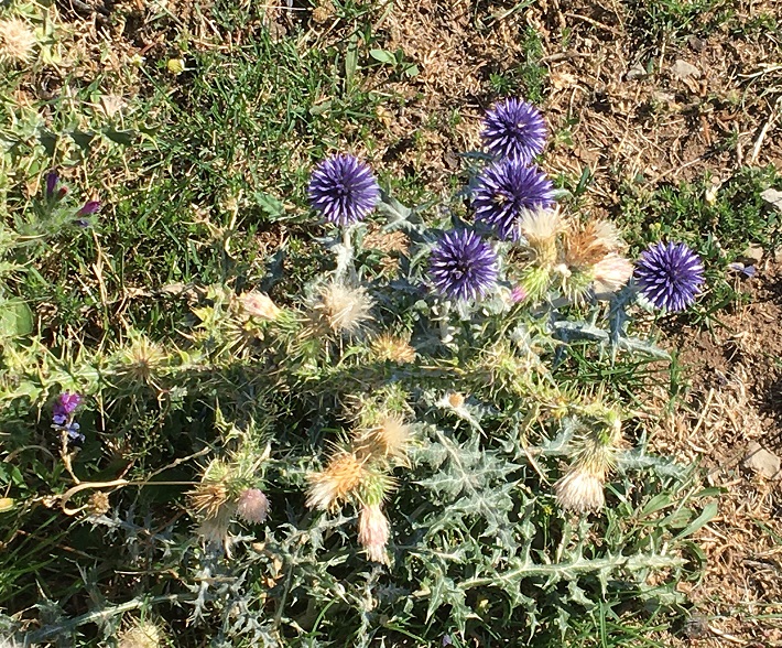 Même les chardons bleus se sentent bien seuls… J’en aurais bien cueillis pour ma pharmacie, mais ne suis pas assez experte pour être sûre que c’est la bonne espèce!