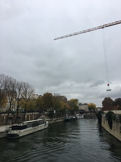 Pas de file devant Berthillon. On n’a plus droit aux glaces. Pas de musiciens sur le pont qui mène à l’arrière de Notre Dame… le silence n’est rompu que par un hors bord de la police, filant sur la Seine désertée par les bateaux-mouche. Et par le bruit des grues. Car les travaux, eux, continuent, comme je vous l’ai montré dans une photo récemment publiée ici et comme le montre celle-ci.