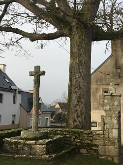 Proche de l’église, la croix est surplombée par un arbre à l’imposant tronc rectiligne. Il s’agit d’un chêne pédonculé, décrit en ces termes par un des auteurs du Bulletin Municipal, qui semble s’être bien documenté pour ce faire : « Cet arbre possède un port d’une élégance rare, trois mètres soixante de tour, dix huit mètres de haut, autant en envergure, voilà ses mensurations prises, en 2009, lors de son recensement dans l’inventaire des arbres remarquables de Bretagne,fait par Bretagne Vivante. » L’auteur s’interroge sur l’âge de l’arbre, mettant savoureusement en scène des personnages que nous devrions connaître, en tant que lecteur/lectrice, pour mieux apprécier les références.