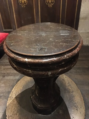 Mais revenons aux anges, ou plutôt angelots, avec ce bénitier proche de la sortie. Comme j’ai raté ma photo, j’en emprunte une autre pour que vous puissiez mieux le voir.