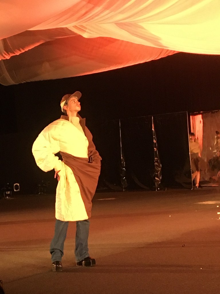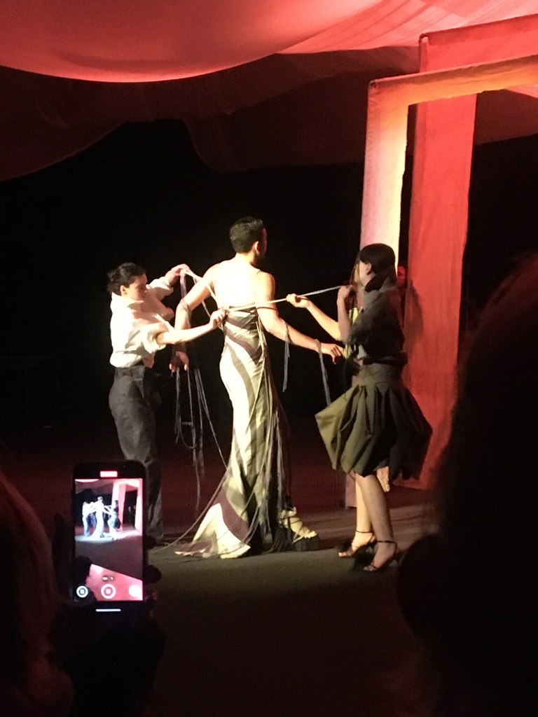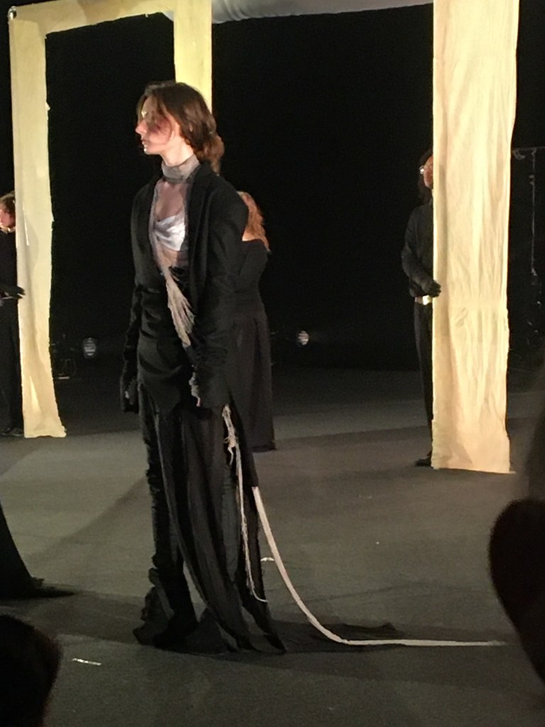 Et les créations de mode, dans tout cela, me direz-vous? Car c’est un peu le risque : la mise en scène peut valoriser ou mettre au second plan la couture… Ce fut un peu le cas au début, mais progressivement les inventions des jeunes créateurs/trices reprirent place. Beaucoup de déstructuration, de confusion de genre, de dérision, mais aussi d’inventions intéressantes. Difficile à photographier car presque jamais stable, et sans lumière, avec mon Iphone… Mais voici quelques exemples, pour les plus curieux d’entre vous.
