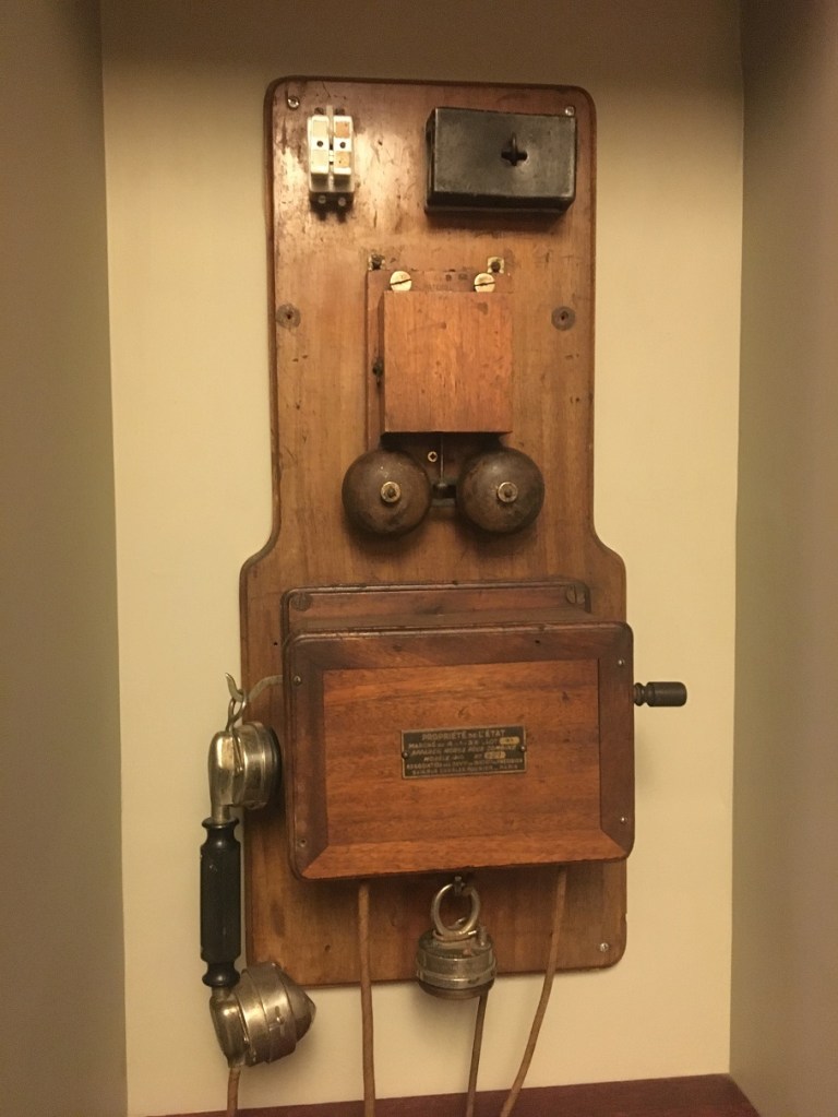 Sur le palier, un fauteuil et un téléphone fleurant bon le siècle passé.