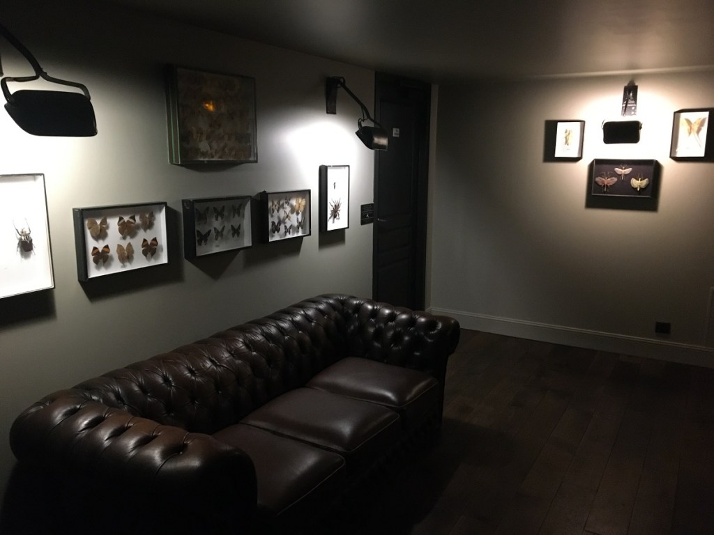 On parvient ensuite à un petit salon orné d’une belle collection de papillons. Une « antichambre » des lieux d’aisance, eux-même décorés de photographies d’artistes du passé.