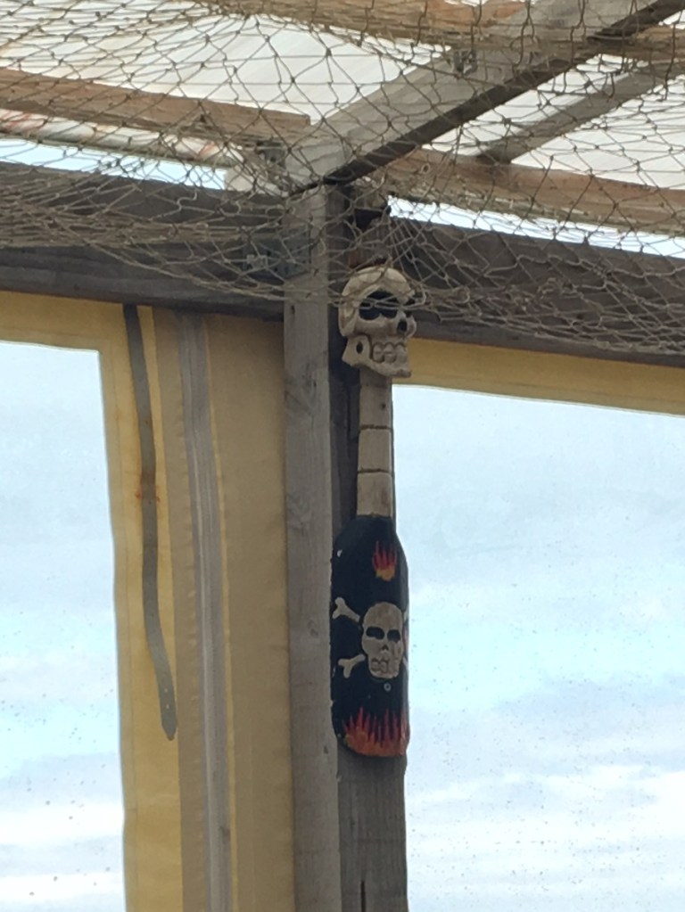 Mais il en est un qui échappe à tout ce fracas : le Café Plage, dont je vous ai parlé jadis. Car je suis depuis le début l’aventure du jeune couple qui a « monté » de toutes pièces ce lieu enchanteur. Au départ, des palettes et des bobines en bois. Puis, progressivement, tables et chaises; couverture provisoire de la terrasse; et, désormais, une terrasse abritée du vent. Car nous sommes sous l’esplanade, au ras des galets. Vue directe, donc, sur la mer, la falaise, le phare. Un endroit idyllique. Ce qui fait enrager, c’est que la loi maritime a été invoquée pour les empêcher de se développer un peu sur les galets. Résultats : pas de soleil pour le déjeuner à cette époque! Alors qu’au début, on se régalait au soleil sur les galets (j’espère que vous avez remarqué le jeu de mots – rires).