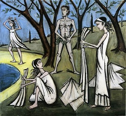 On trouve même un lexique très spécifique, lié à la lessive – le fait de laver ce qui est sale « πλύνω : laver, et son composé conjugué : ἀποπλύνεσκε : « lavait d’habitude »; ῥύπα : ce qui est sale » – comme στεῖβον < στείβω : fouler aux pieds du linge pour le nettoyer. Les jeunes filles foulent le linge au pied, avant de l’étendre sur des pierres blanchies par les flots et chauffées par le soleil. Elles en profitent alors pour s’adonner au plaisir du bain, puis s’oignent d’huile… Je vous laisse imaginer… ou lire… la suite… Un indice dans ce tableau (pour une iconographie assez fournie sur le héros et les Phéaciens, voir ce site)…