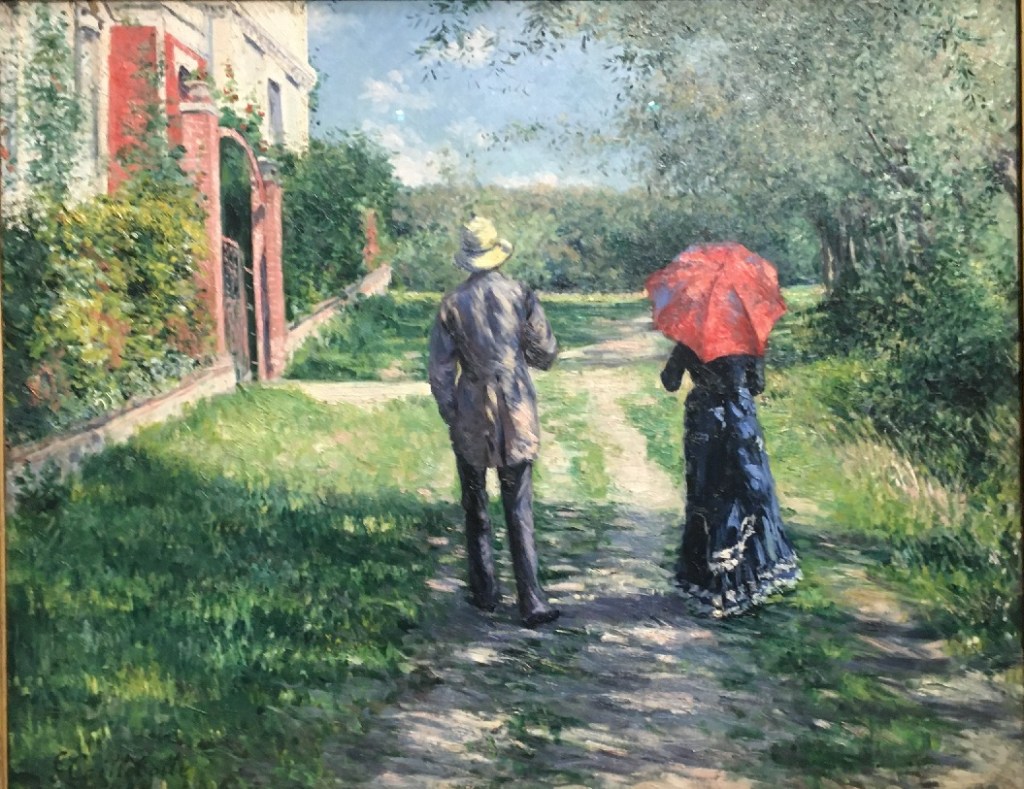 Au-delà du canotage et de la voile, la nature offre d’autres plaisirs à Gustave, qui aime notamment jardiner. Avec passion et avec soin. Car ce perfectionniste ne fait rien sans rigueur… Dans l’exposition, davantage tournée vers la vie urbaine comme vous le découvrirez par la suite, peu de tableaux représentant cette nature, domestiquée ou non. Mais on découvre d’une part le peintre qui aime à représenter des promeneurs, solitaires ou non, et d’autre part le jardinier prenant soin de ses plantations.