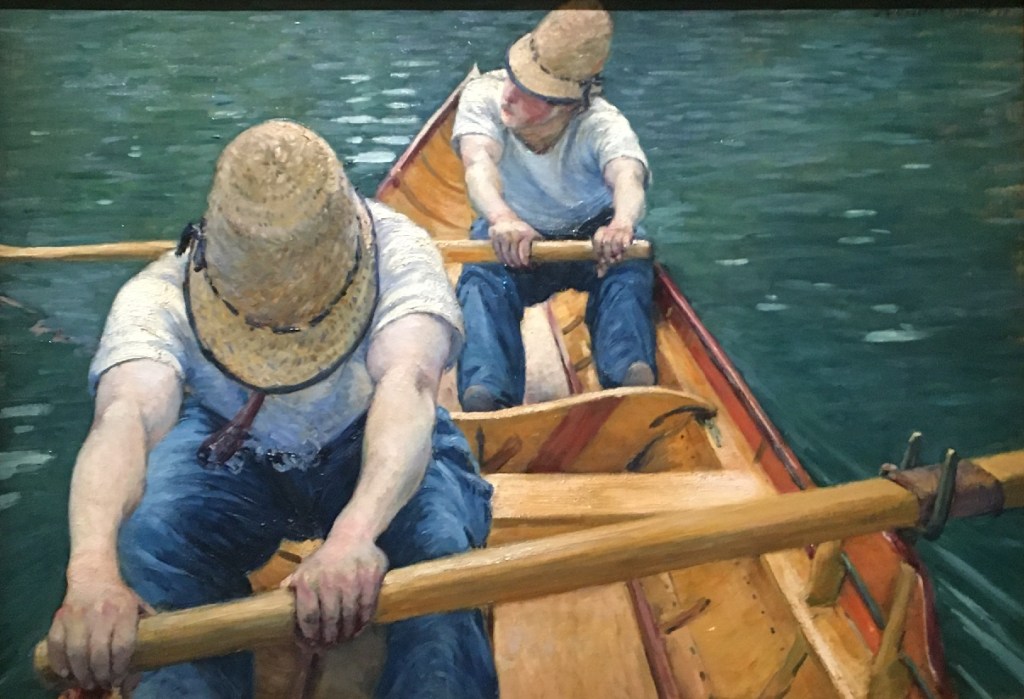 Contrairement aux tableaux consacrés aux canots, on ne distingue pas bien les corps ni les têtes des navigateurs, qui restent dans un flou subtil…