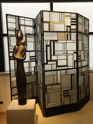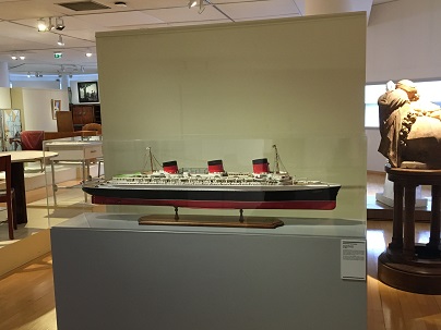 Je suis un peu surprise, sur le moment, de découvrir, entre la succession d’espaces dédiés à la sculpture, une maquette du Paquebot Normandie. Que fait ici ce joyau de la construction navale française, plus spécifiquement nazairienne ? Certes, il date des années 30, puisqu’en 1935, lors de son lancement, il est le plus grand paquebot du monde « plus long que la Tour Eiffel », à la salle à manger « plus vaste que la Galerie des Glaces de Versailles », pouvant accueillir plus de 3300 personnes (si vous voulez en savoir plus, voici un documentaire à ce sujet) ?