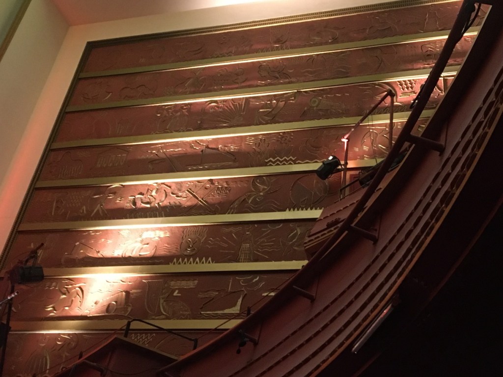 Depuis bien longtemps je « suis » cette chorégraphe hors normes, qui m’a séduite dès que je l’ai vue en Avignon, voici… je ne sais combien d’années… La dernière fois que je l’ai vu danser, c’était au Musée d’Orsay, et elle était seule, non sur une scène mais sur le sol, devant nous qui étions assis-e-s par terre. Maintenant elle ne danse plus, je pense? Mais elle continue de créer, encore et encore. Et de nous enchanter. Ce fut le cas cette semaine, dans la salle du Théâtre Libre, dont les « hiéroglyphes » et les « sequins-boucliers » m’interpellent.