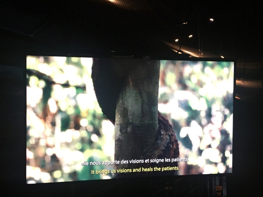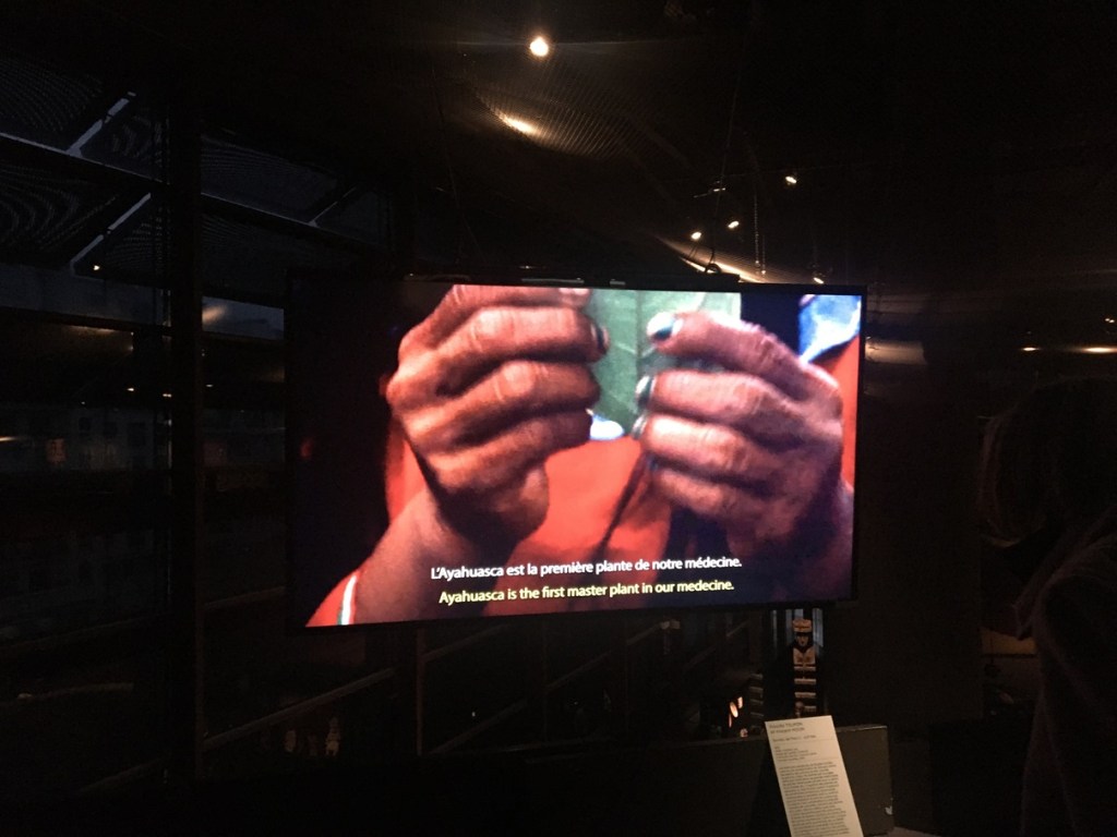 Donc l’exposition porte sur cette plante et ses effets sur celles et ceux qui l’ingèrent dans un breuvage « composé de deux ingrédients: la liane Ayahuasca (Banisteriopsis caapi) et les feuilles de chakruna (Psychotria viridis)« , dont la première vidéo (elles sont très nombreuses en proportion de la petite taille de l’exposition) explique qu’il fait d’abord vomir avant de provoquer les hallucinations qui permettent de créer.