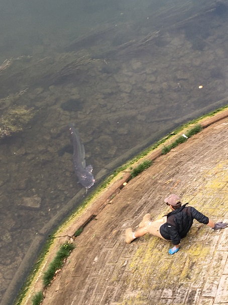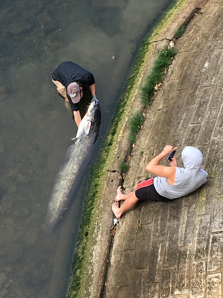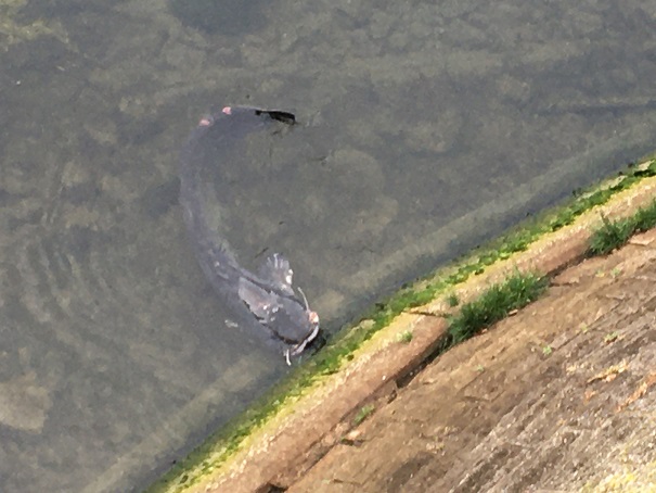 Je vous présente une magnifique femelle « silure glane« . Qui l’a amenée dans cette fâcheuse position, sur les bords du quai? Rassurez pas, non point un vilain prédateur ni un accident fluvial, mais un jeune pêcheur, l’auteur de l’attroupement dont je parlais précédemment.