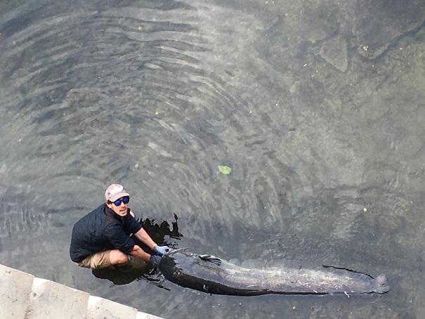 A Paris le silure est recherché par les pêcheurs sportifs, qui le pêchent avec de grandes précautions (hameçons spéciaux, sans le sortir de l’eau comme vous l’avez vu, etc) pour assurer sa remise à l’eau dans de bonnes conditions qui ne perturbent pas son comportement naturel. L’association de pêche de Paris (Union des pêcheurs de Paris) dont je fais partie s’occupe de la protection des espèces aquatiques notamment en luttant contre les braconniers (des trafiquants pour le marché noir des pays de l’Est s’attaquent parfois aux silures).«