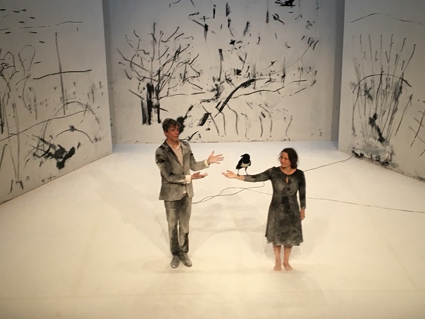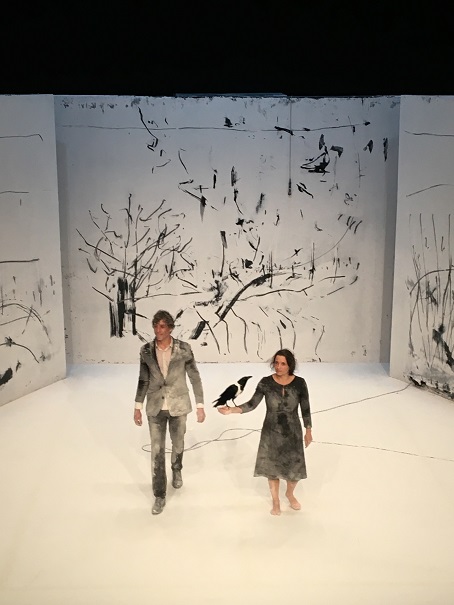 Surgit alors un corbeau, qui s’en empare et le déchiquète consciencieusement… puis va et vient de bord en bord sur la scène, côté cour, côté jardin et ainsi de suite.