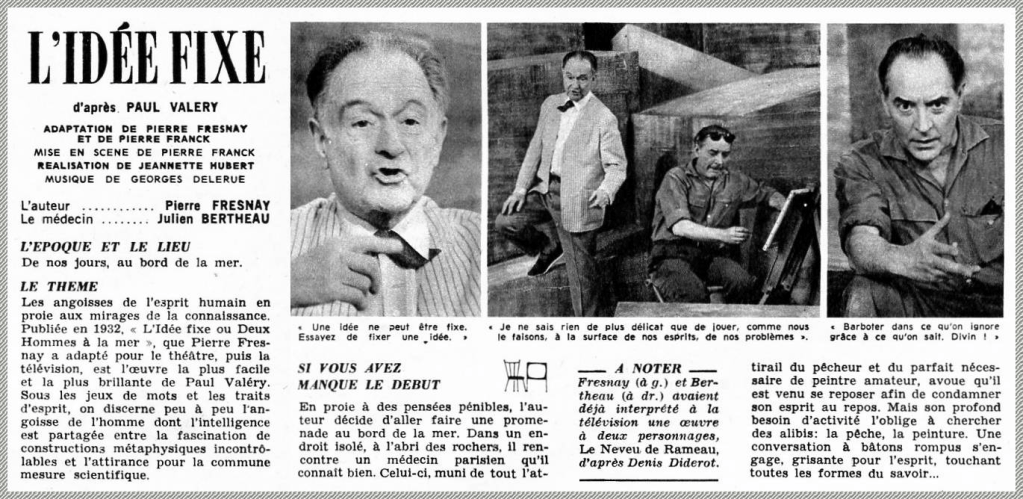 Impossible de trouver quoi que ce soit sur les représentations de 1968, mais les deux acteurs aimaient jouer ensemble. On peut les voir dans Le Neveu de Rameau, ou encore dans L’Idée Fixe, dont la facture n’est pas sans rappeler le Dialogue…