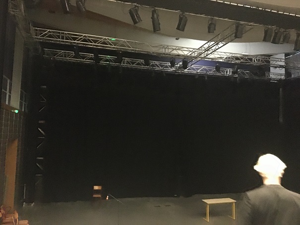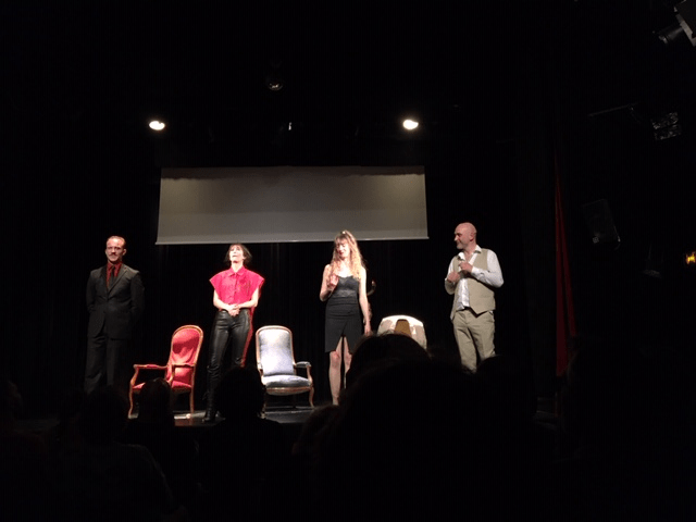 Décor minimaliste s’il en fut! Un homme demande que l’on descende le plus près possible de la scène. « Faute de quoi », dit-il, « vous n’entendrez rien ». Il fallait comprendre le verbe dans le sens de la compréhension, pas de l’audition, comme je m’en apercevrai plus tard, après le discours introductif. Car, après une sorte de ballet pour l’entrée des acteurs et actrices, le sens des mots et des phrases ne fut pas toujours saisissable, loin de là. On ne peut leur en vouloir : comme nous l’apprendrons plus tard, ce sont des jeunes gens venant d’Italie, de Suisse, de Taïwan, de Russie, du Brésil… et j’en oublie…, tous et toutes étudiant-e-s de Français Langue Etrangères, alias FLE.